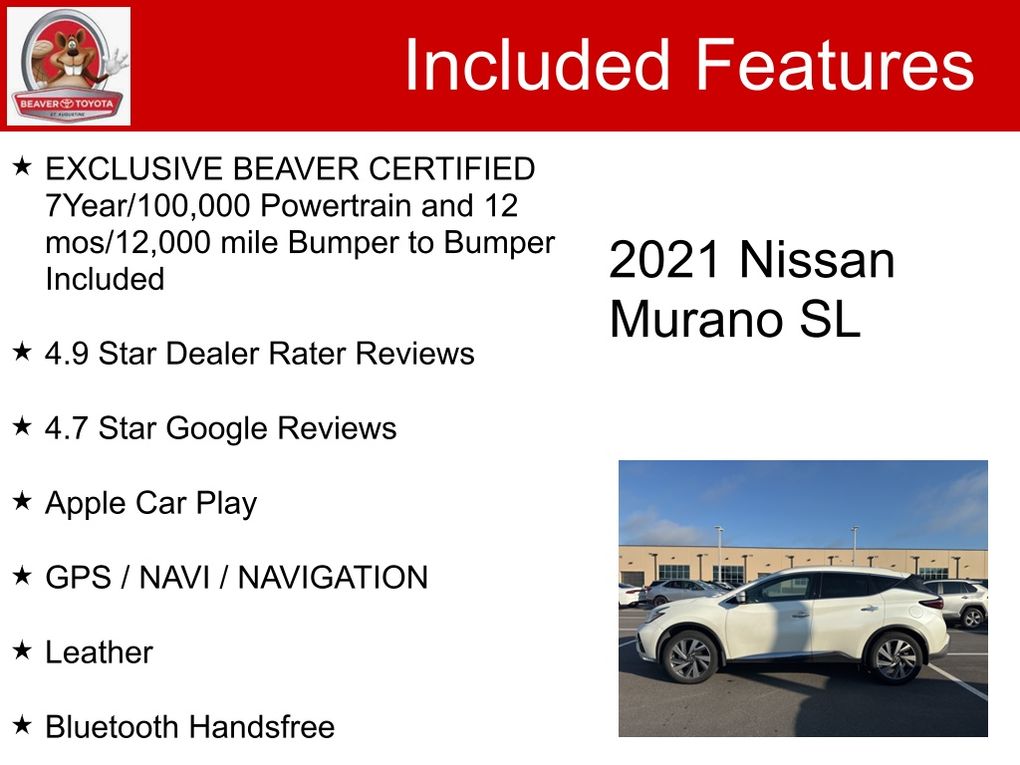 Pearl White Tricoat 2021 Beaver Nissan Murano SL is a 4D Sport Utility FWD . This Florida SUV has a 3.5L V6 DOHC 24V engine. Call right now and schedule a test drive. Ask for stock number 2601133A, the Florida 2021 Beaver Nissan Murano . Shop Us Online at www.beavertoyotastaugustine.com. Serving Jacksonville, Palm Coast, Daytona, Gainesville and St Augustine. Beaver Toyota St Augustine on 2995 US Hwy 1 South in St Augustine.