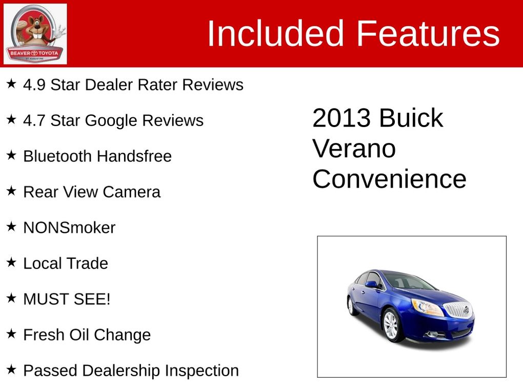 Discover the perfect blend of style, comfort, and performance in this exceptional 2013 Buick Verano Convenience Group. With its striking blue exterior and meticulously maintained interior, this Verano is a true standout in the compact luxury segment.