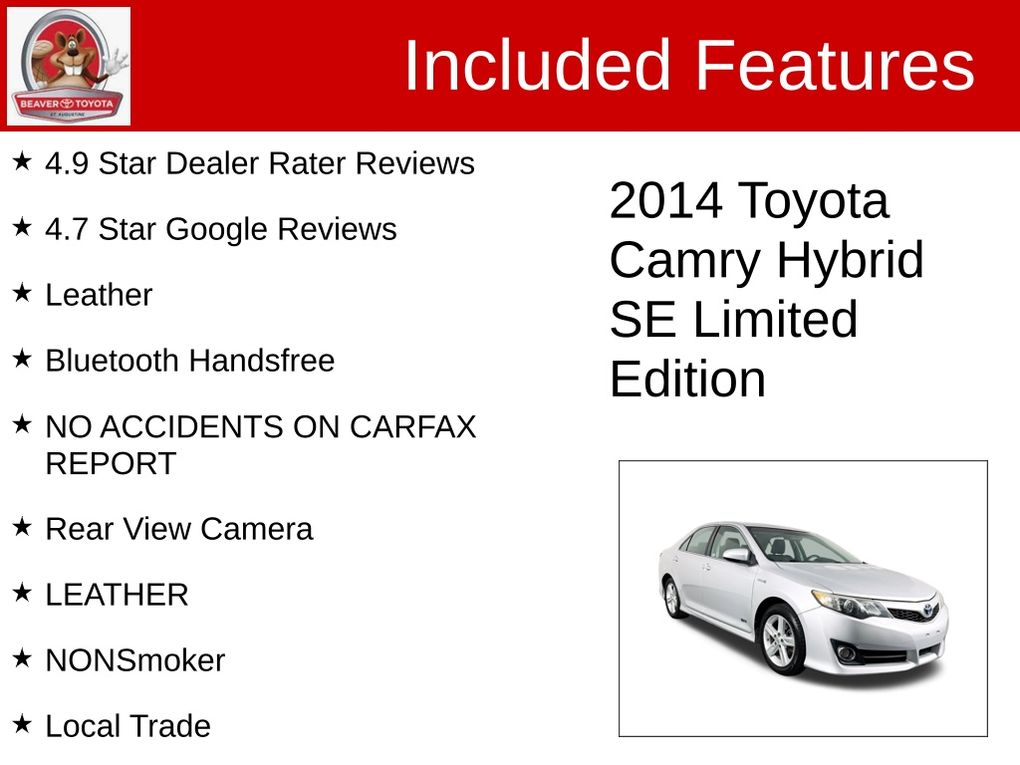 Clean CARFAX. 4.9 Star Dealer Rater Reviews, 4.7 Star Google Reviews, Leather, Bluetooth Handsfree, NO ACCIDENTS ON CARFAX REPORT, Rear View Camera, LEATHER, NONSmoker, Local Trade, MUST SEE!, Fresh Oil Change, Passed Dealership Inspection, Freshly Detailed, EXCELLENT CONDITION, Back Up Camera, Leather Interior, Alloy Wheels, Power Driver's Seat, Premium Wheels, LCD Display Screen, Fully Serviced and Detailed, LOOKING TO BUY, AN AFFORDABLE USED CAR ,THE USED CAR YOU CAN TRUST ,THE ONLY SERVICED AND INSPECTED USED CARS IN THE MARKET THAT WILL GIVE YOU THE PEACE OF MIND!!, 2.5L I4 Hybrid DOHC, ABS brakes, Alloy wheels, Compass, Electronic Stability Control, Front dual zone A/C, Heated door mirrors, Illuminated entry, Low tire pressure warning, Remote keyless entry, Traction control.