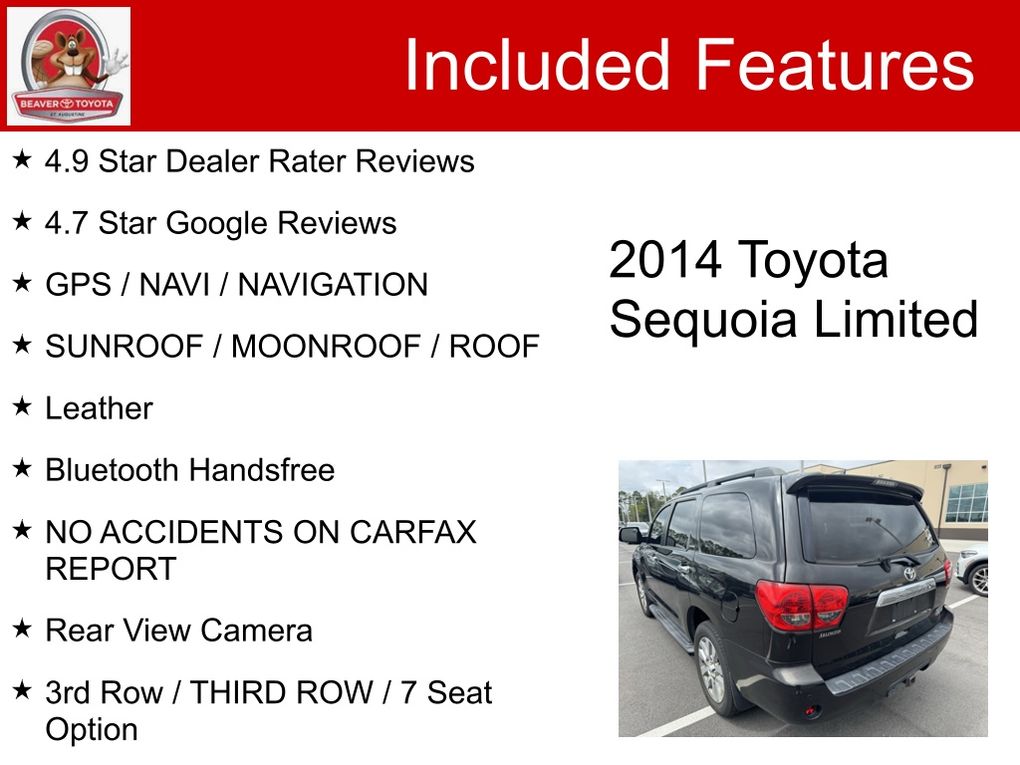 CARFAX One-Owner. Clean CARFAX. 4.9 Star Dealer Rater Reviews, 4.7 Star Google Reviews, GPS / NAVI / NAVIGATION, SUNROOF / MOONROOF / ROOF, Leather, Bluetooth Handsfree, NO ACCIDENTS ON CARFAX REPORT, Rear View Camera, 3rd Row / THIRD ROW / 7 Seat Option, LEATHER, One Owner, NONSmoker, Local Trade, Towing Package, MUST SEE!, Fresh Oil Change, Passed Dealership Inspection, Freshly Detailed, EXCELLENT CONDITION, Back Up Camera, Leather Interior, Alloy Wheels, Power Driver's Seat, Rear A/C, Power Sunroof, Premium Wheels, LCD Display Screen, Fully Serviced and Detailed, WOW LOOKING FOR THAT INEXPENSIVE SEQUOIA ,WHAT ABOUT BUYING A USED CAR THAT IS FULLY SERVICED AND INSPECTED!!, WHEN YOU BUY A USED CAR FROM BEAVER TOYOTA YOU KNOW THAT YOU CAN SLEEP AT NIGHT ,THE PEACE OF MIND NO OTHER DEALERSHIP CAN GIVE YOU!!, Navigation System.Black 2014 Toyota Sequoia Limited RWD i-Force 5.7L V8 DOHC VVT-iWe provide you with world class service using the most advanced technology to service your car, by our friendly and compassionate team of sales specialists! Our Sales team consists of individuals handpicked to deliver a sales experience like no other. We want your experience to be unique and cater to your individuality. Our Sales team is committed to providing this experience! We want you to know we’re listening, so please, feel free to always let us know how we can better serve you, or merely to express how unique your experience was here at Beaver Toyota!!Awards: * 2014 KBB.com Best Resale Value AwardsTHIS VEHICLE HAS BEEN PROFESSIONALLY HAND PICKED, SERVICED AND DETAILED TO INCLUDE *$2000 IN RECENT VEHICLE INVESTMENTS: • Multi Point Inspection o Visually inspect all safety components o Check fluids, belts, brakes, tires, batteries etc o Certified technician road test • Oil and Filter Service o Replace oil and filters o Replace cabin filter o Replace air filter • Interior and Exterior Detailing o Thoroughly Vacuum o Thoroughly Clean Interior Surfaces and Panels o Treat with Conditioners o Interior Control Cleaning o Hand Wash and Wax o Clean Door Jambs and Hinges o Clean Rims, Tires and Windows o Clean Engine Compartment Disclaimer: *$2000 based on average reconditioning costs. WHY BEAVER TOYOTA ST AUGUSTINE? GUEST EXPERIENCE: At Beaver Toyota St Augustine, we’re here to WOW YA and our staff is 100% dedicated to customer satisfaction. We understand that you want a fast, fair and transparent experience throughout the car buying process and every member of our team is equipped to help. WE GIVE BACK: We believe in paying it forward and taking care of our community. With that in mind, every purchase helps support local schools, nonprofit organizations and businesses through our Acts of Wow. FINANCING OPTIONS: Take advantage of our attractive low-rate financing options. We have access to credit unions and national banks to provide financing for most credit levels. We can tailor a finance package to fit your needs. To get started, complete our secure online credit application.