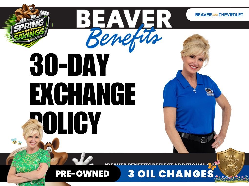 30 day used car exchange policy– Applies to all used vehicles purchased from the dealership excluding Beaver Bargains, vehicles 7+ years old or with over 100,000 miles. A full credit for the vehicle’s purchase price, excluding tax, tag and fees, will be applied as a trade allowance towards the purchase of a vehicle of greater or equal value. Exchanges cannot be combined with sales, discounts and/or incentivized pricing. If the vehicle incurs more than 1000 miles during the 30-day period, there will be mileage deduction of $.25 per mile towards the credit. All vehicles will undergo an inspection, and any new or additional damage will be deducted from credit.