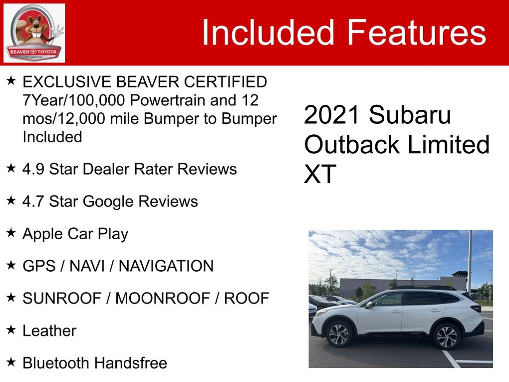 Elevating your peace of mind, this 2021 Subaru Outback Limited XT has been meticulously inspected and certified by our team of experts. Backed by an exclusive BEAVER CERTIFIED 7-Year/100,000-Mile Powertrain Warranty and a 12-Month/12,000-Mile Bumper-to-Bumper Warranty, you can drive with the utmost confidence, knowing your investment is protected.