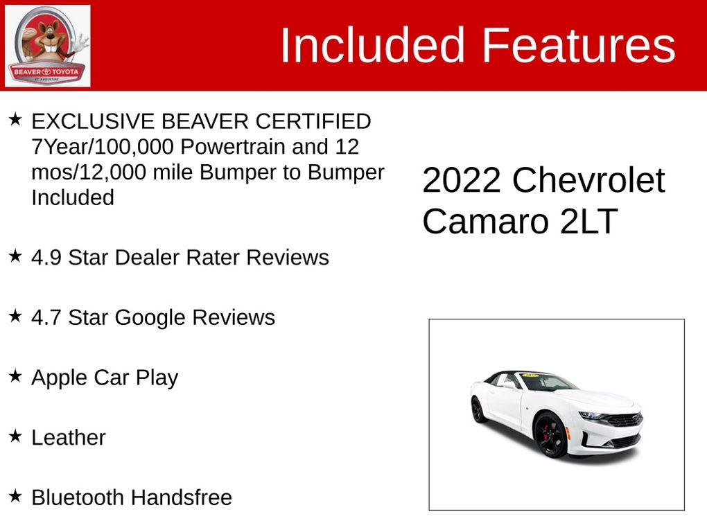 Certified. EXCLUSIVE BEAVER CERTIFIED 7Year/100,000 Powertrain and 12 mos/12,000 mile Bumper to Bumper Included, 4.9 Star Dealer Rater Reviews, 4.7 Star Google Reviews, Apple Car Play, Leather, Bluetooth Handsfree, BEAVER CERTIFIED*7 YEAR/100K MILE WARRANTY*$0 DEDUCTIBLE*BUY WITH PEACE OF MIND, Rear View Camera, LEATHER, NONSmoker, Local Trade, MUST SEE!, Fresh Oil Change, Passed Beaver Certified Multi Point Inspection, Passed Dealership Inspection, Freshly Detailed, EXCELLENT CONDITION, Back Up Camera, Blind Spot Monitor, Leather Interior, Alloy Wheels, Power Driver's Seat, Premium Wheels, LCD Display Screen, Fully Serviced and Detailed, THE CAMARO CONVERTIBLE YOU WERE LOOKING FOR HAS JUST ARRIVED ,AND GUESS WHAT ITS FULLY CERTIFIED ,BECAUSE AT BEAVER TOYOTA WE CAN CERTIFY ANY NON TOYOTA PRODUCT IN THE MARKET!!, ABS brakes, Alloy wheels, Compass, Electronic Stability Control, Front dual zone A/C, Heated Driver & Front Passenger Seats, Heated front seats, Illuminated entry, Low tire pressure warning, Remote keyless entry, Traction control.