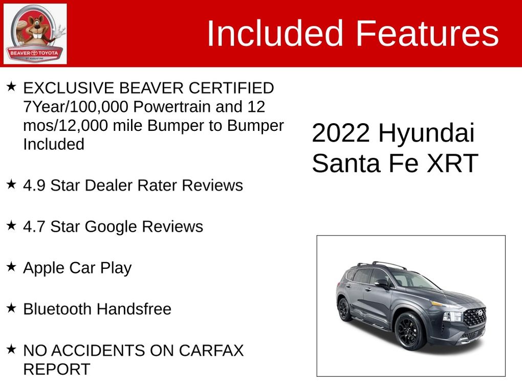 Don't miss the opportunity to experience the exceptional 2022 Hyundai Santa Fe XRT. Visit our showroom today and let us demonstrate why this SUV is the perfect choice for your next adventure. With our commitment to customer satisfaction and our unbeatable BEAVER CERTIFIED warranty, you can drive away with confidence and peace of mind.