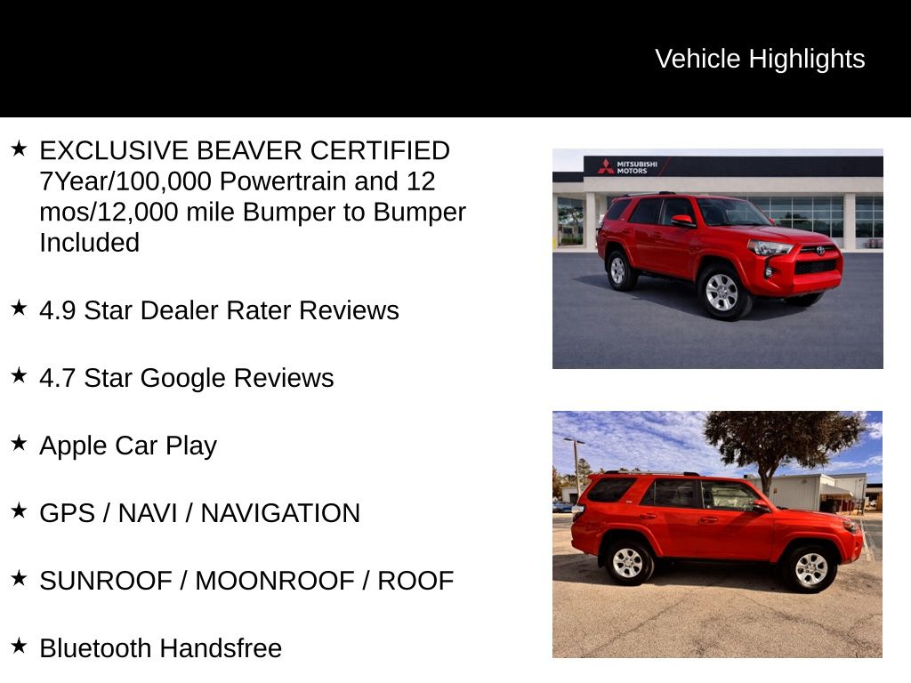 As a Beaver Certified vehicle, this 4Runner has undergone a rigorous multi-point inspection and is backed by an industry-leading warranty, allowing you to purchase with confidence. Our team of experts has carefully evaluated every aspect of this SUV, from the powerful engine to the premium interior features, to ensure it meets the highest standards of quality and performance.