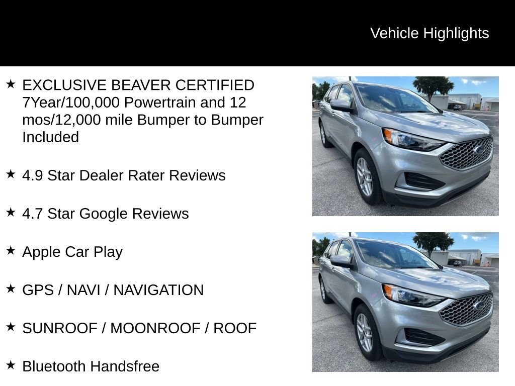 CARFAX One-Owner. Certified. EXCLUSIVE BEAVER CERTIFIED 7Year/100,000 Powertrain and 12 mos/12,000 mile Bumper to Bumper Included, 4.9 Star Dealer Rater Reviews, 4.7 Star Google Reviews, Apple Car Play, GPS / NAVI / NAVIGATION, SUNROOF / MOONROOF / ROOF, Bluetooth Handsfree, BEAVER CERTIFIED*7 YEAR/100K MILE WARRANTY*$0 DEDUCTIBLE*BUY WITH PEACE OF MIND, Rear View Camera, One Owner, LEATHERETTE, Fresh Oil Change, Passed Beaver Certified Multi Point Inspection, Passed Dealership Inspection, Freshly Detailed, Back Up Camera, Blind Spot Monitor, Alloy Wheels, Power Sunroof, Fully Serviced and Detailed.21/28 City/Highway MPGIconic Silver Metallic 2024 Ford Edge SEL AWD EcoBoost 2.0L I4 GTDi DOHC Turbocharged VCTWe provide you with world class service using the most advanced technology to service your car, by our friendly and compassionate team of sales specialists! Our Sales team consists of individuals handpicked to deliver a sales experience like no other. We want your experience to be unique and cater to your individuality. Our Sales team is committed to providing this experience! We want you to know we’re listening, so please, feel free to always let us know how we can better serve you, or merely to express how unique your experience was here at Beaver Mitsubishi!Certification Program Details: EXCLUSIVE BEAVER CERTIFIED WARRANTY includes 7 Year/100,000 Miles Powertrain Coverage 12 Months/12,000 Bumper to Bumper CoverageTHIS VEHICLE IS BEAVER CERTIFIED: • 7 year/ 100,000 mile powertrain warranty o Protection covers engine, transmission and front/rear wheel drive • 12 month/ 12,000 mile limited warranty o Comprehensive protection on additional components • 24 hour roadside assistance o Towing, lock out and fuel services • Nationwide coverage o Effective anywhere in the US • Special Financing rates o Attractive finance options for certified vehicles THIS VEHICLE HAS BEEN PROFESSIONALLY HAND PICKED, SERVICED AND DETAILED TO INCLUDE *$2000 IN RECENT VEHICLE INVESTMENTS: • Multi Point Inspection o Visually inspect all safety components o Check fluids, belts, brakes, tires, batteries etc o Certified technician road test • Oil and Filter Service o Replace oil and filters o Replace cabin filter o Replace air filter • Interior and Exterior Detailing o Thoroughly Vacuum o Thoroughly Clean Interior Surfaces and Panels o Treat with Conditioners o Interior Control Cleaning o Hand Wash and Wax o Clean Door Jambs and Hinges o Clean Rims, Tires and Windows o Clean Engine Compartment Disclaimer: *$2000 based on average reconditioning costs. WHY BEAVER MITSUBISHI? GUEST EXPERIENCE: At Beaver Mitsubishi, we’re here to WOW YA and our staff is 100% dedicated to customer satisfaction. We understand that you want a fast, fair, and transparent experience throughout the car buying process and every member of our team is equipped to help. WE GIVE BACK: We believe in paying it forward and taking care of our community. With that in mind, every purchase helps support local schools, nonprofit organizations, and businesses through our Acts of Wow. FINANCING OPTIONS: Take advantage of our attractive low-rate financing options. We have access to credit unions and national banks to provide financing for most credit levels. We can tailor a finance package to fit your needs. To get started, complete our secure online credit application.