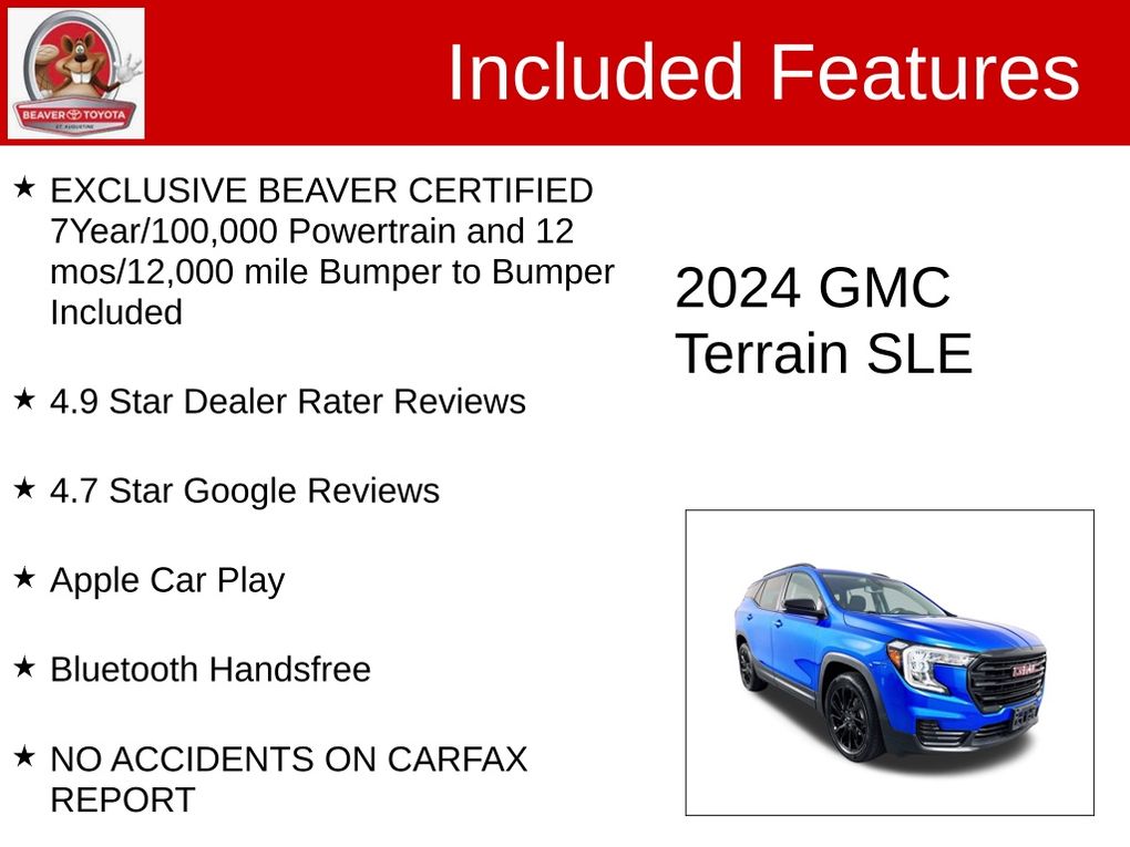 As a Beaver Certified pre-owned vehicle, this 2024 GMC Terrain SLE comes with a comprehensive 7-year/100,000-mile powertrain warranty and a 12-month/12,000-mile bumper-to-bumper warranty, giving you the peace of mind and confidence you deserve. With a clean CARFAX report and a pristine one-owner history, this Terrain has been meticulously maintained and is ready to provide you with years of reliable and satisfying performance.
