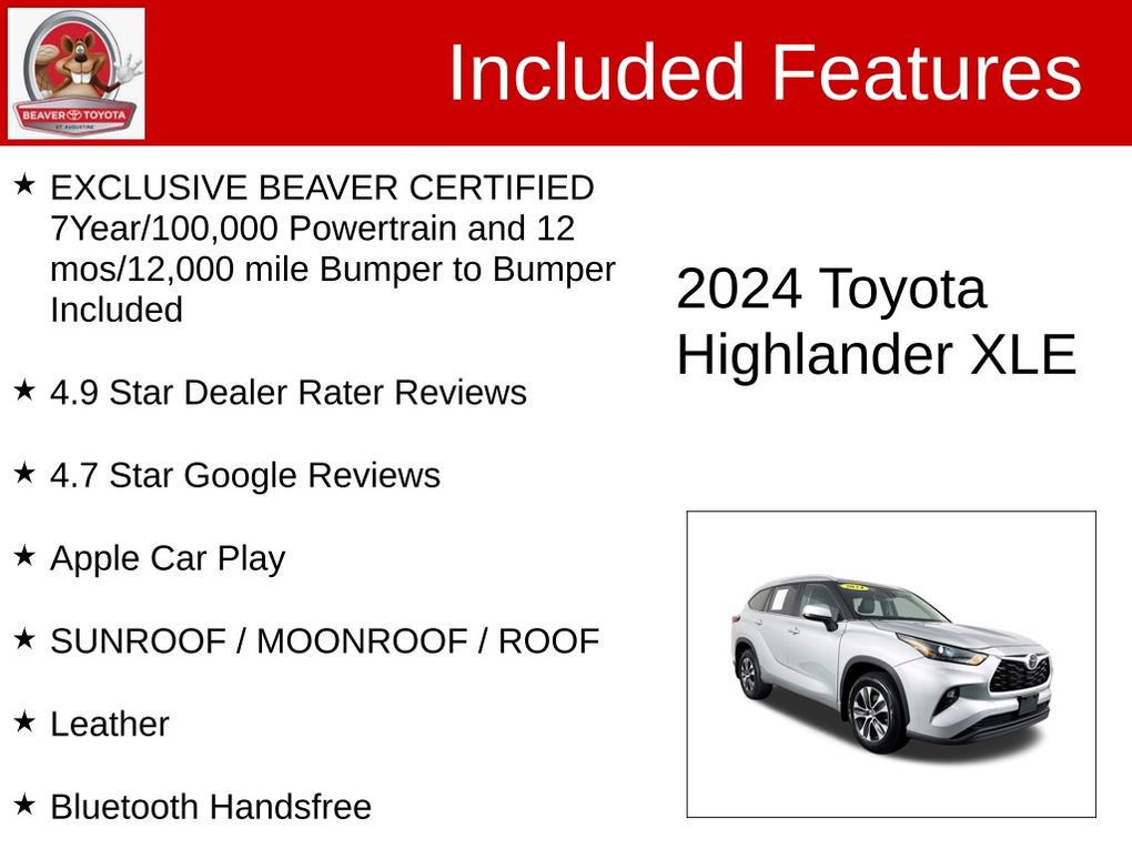 Don't settle for anything less than the best. Experience the exceptional 2024 Toyota Highlander XLE and discover the peace of mind that comes with owning a Beaver Certified vehicle. Visit our showroom today and let us help you find the perfect SUV to elevate your driving experience.