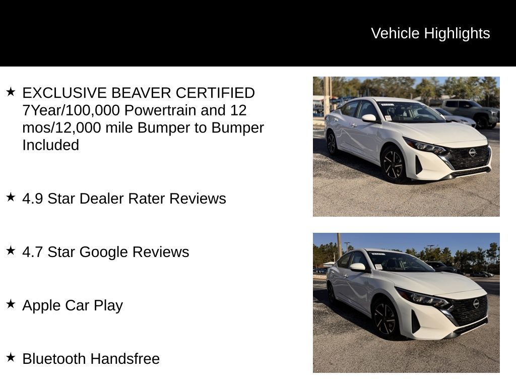 BEAVER CERTIFIED: This 2025 Nissan Sentra SV has undergone a rigorous multi-point inspection and is backed by our exclusive Beaver Certified program. Enjoy the peace of mind of a 7-year/100,000-mile powertrain warranty and a 12-month/12,000-mile bumper-to-bumper warranty, all with a $0 deductible.