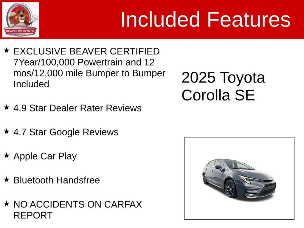 This 2025 Toyota Corolla SE is Beaver Certified, which means it has undergone a rigorous multi-point inspection and comes with an exclusive 7-year/100,000-mile powertrain warranty and a 12-month/12,000-mile bumper-to-bumper warranty. You can purchase this vehicle with complete confidence, knowing that it has been meticulously maintained and backed by our commitment to your satisfaction.